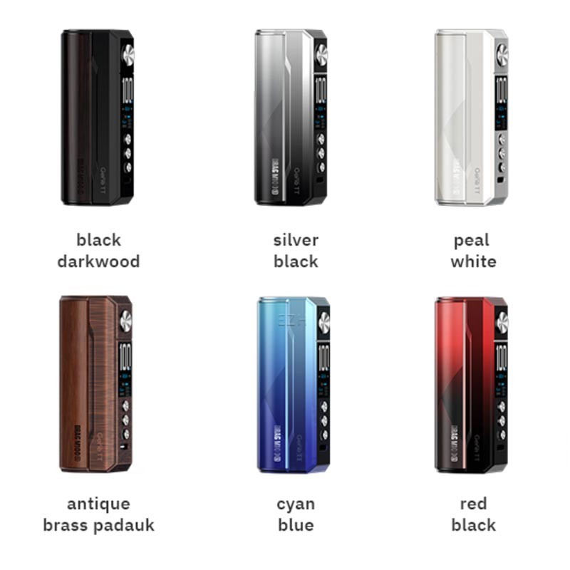 Der Drag M100S Mod erweitert die berühmte Drag-Reihe von VooPoo um einen kompakten und leistungsstarken Single-Akku Box-Mod. Das Gehäuse dieses modernen und eleganten Akkuträgers besteht aus einer robusten Zink-Legierung und ist in verschiedenen Ausführungen erhältlich, darunter Darkwood, Padauk oder AG, mit einer aufwändigen Lackierung. Mit seiner ergonomischen Form liegt der M100S Box-Mod angenehm in der Hand und lässt sich leicht und bequem bedienen. Verdampfer mit einem Durchmesser von bis zu 29mm passen ohne Überhang auf den gefederten 510er Anschluss, und mit sechs verschiedenen Varianten zieht dieser Mod garantiert bewundernde Blicke auf sich.
