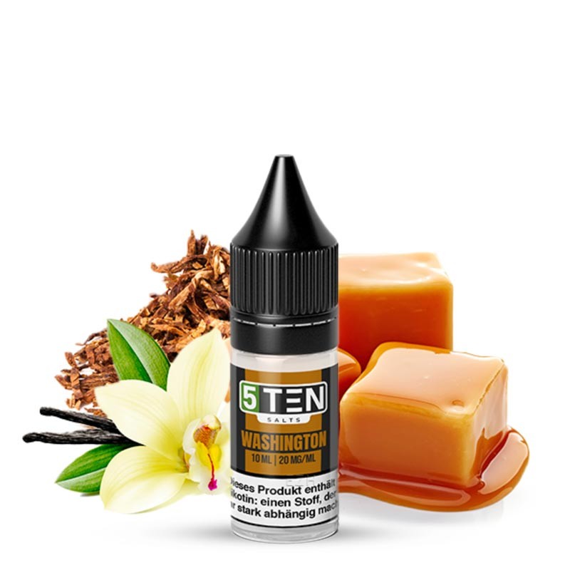 Das Nikotinsalz-Liquid "Washington" von 5 Ten (bekannt für die 510 Cloudpark Longfills) ist eine köstliche Kombination aus einem vollmundigen Tabak, edler Vanille und süßem Karamell, die auch für Nicht-Tabakliebhaber eine Geschmacksexplosion darstellt. Der Tabak zeichnet sich durch rauchige und herbe Noten aus, die von holzigen Aromen begleitet werden und dabei nicht zu dominant sind. Ergänzt wird der Tabakgeschmack durch süße und elegante Vanillenoten sowie den köstlich süßen Geschmack von Karamell, der auch Röstaromen in sich trägt. Das Ergebnis ist ein vollmundiges Tabakerlebnis mit süßen Dessert-Noten, das jederzeit genossen werden kann.